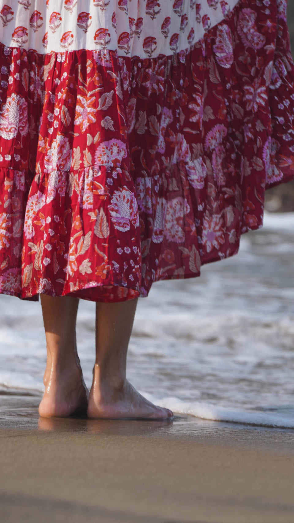The beautiful tiered maxi dress features a floral print in a red and white color scheme and flared tiered, crafted from 100% cotton fabric. This stylish outfit is designed with half sleeves and a hand block print. The vibrant flowers evoke a sense of romance and capture the carefree spirit of summer, making it the perfect choice for any occasion.