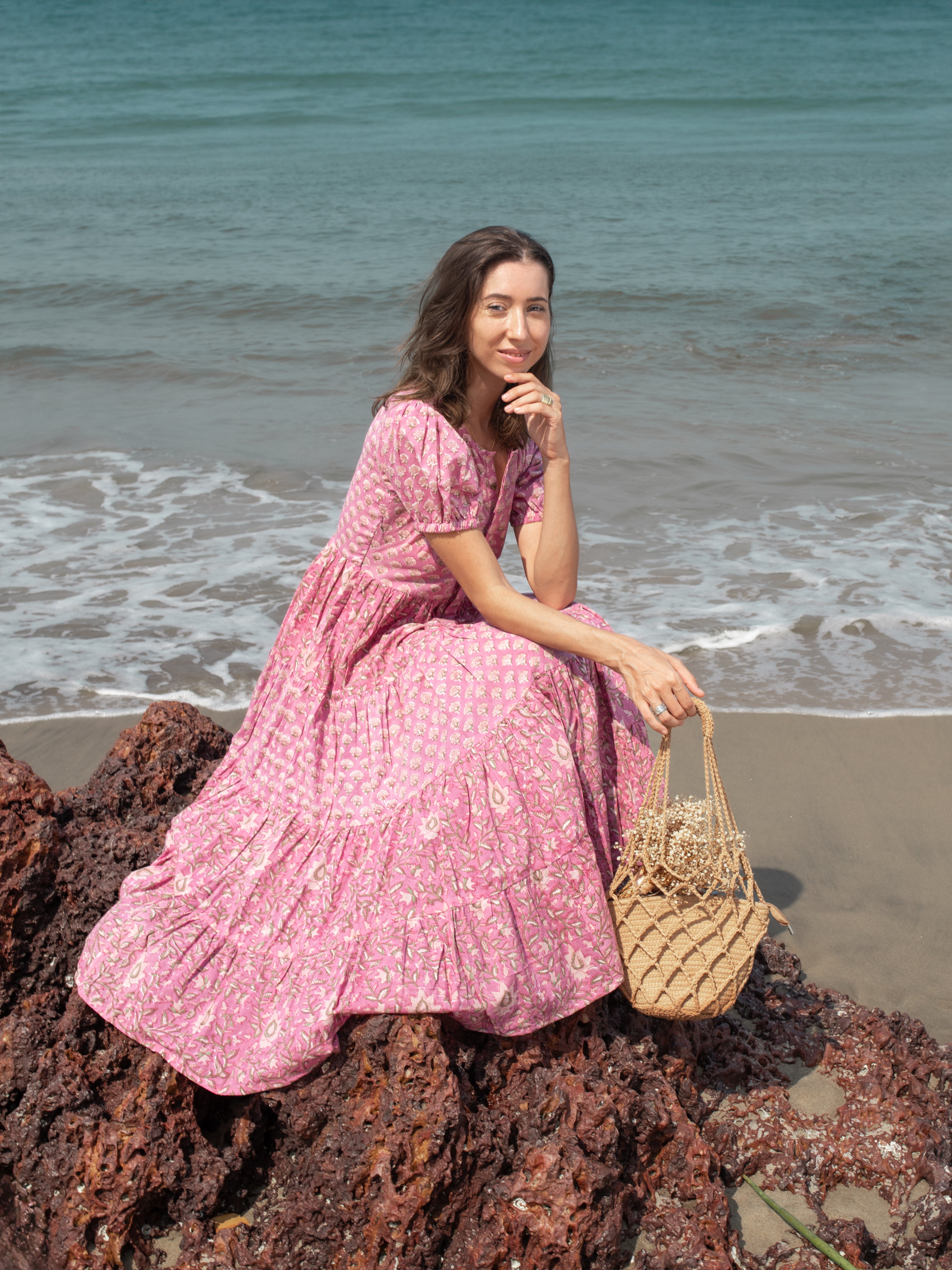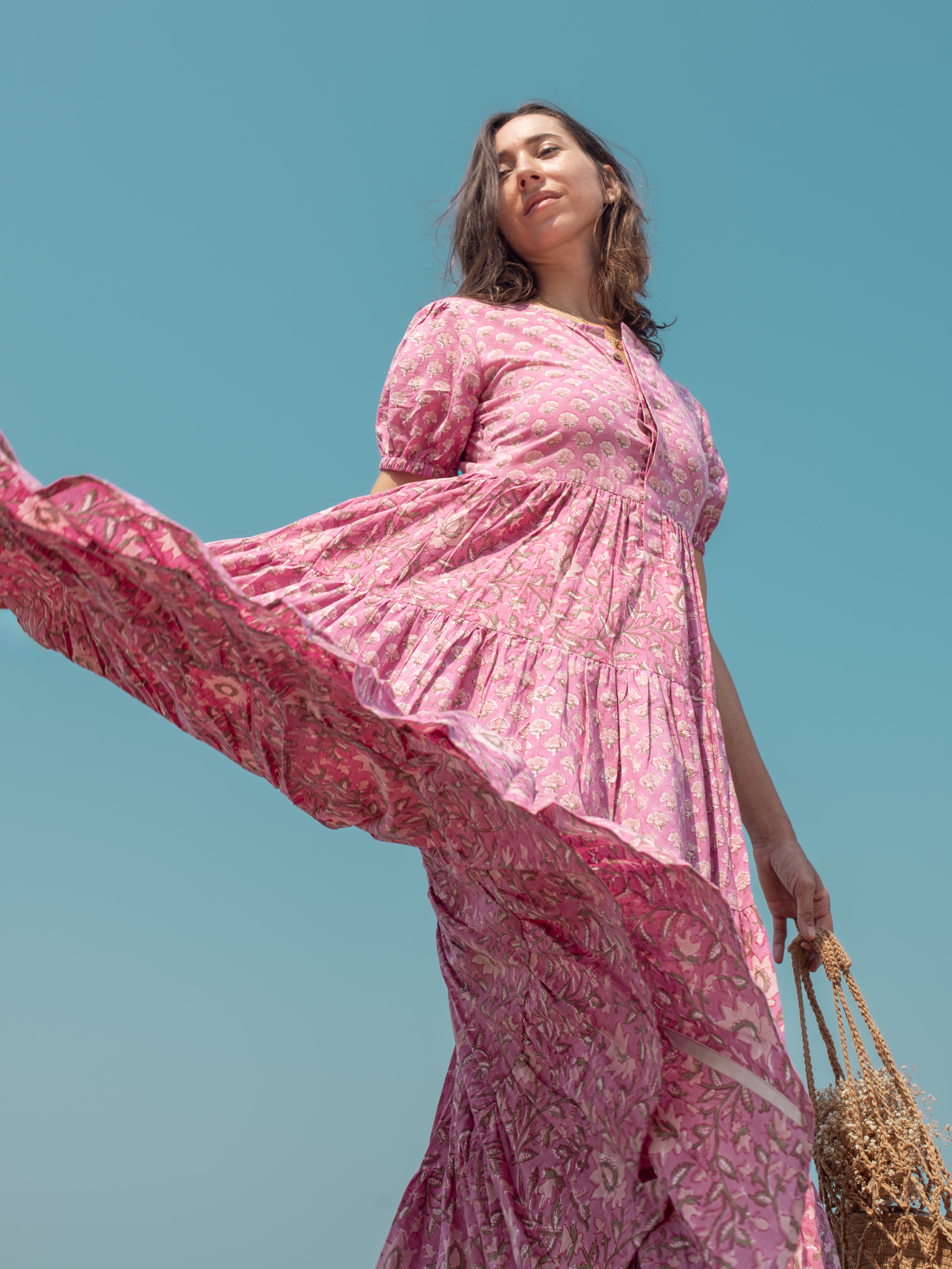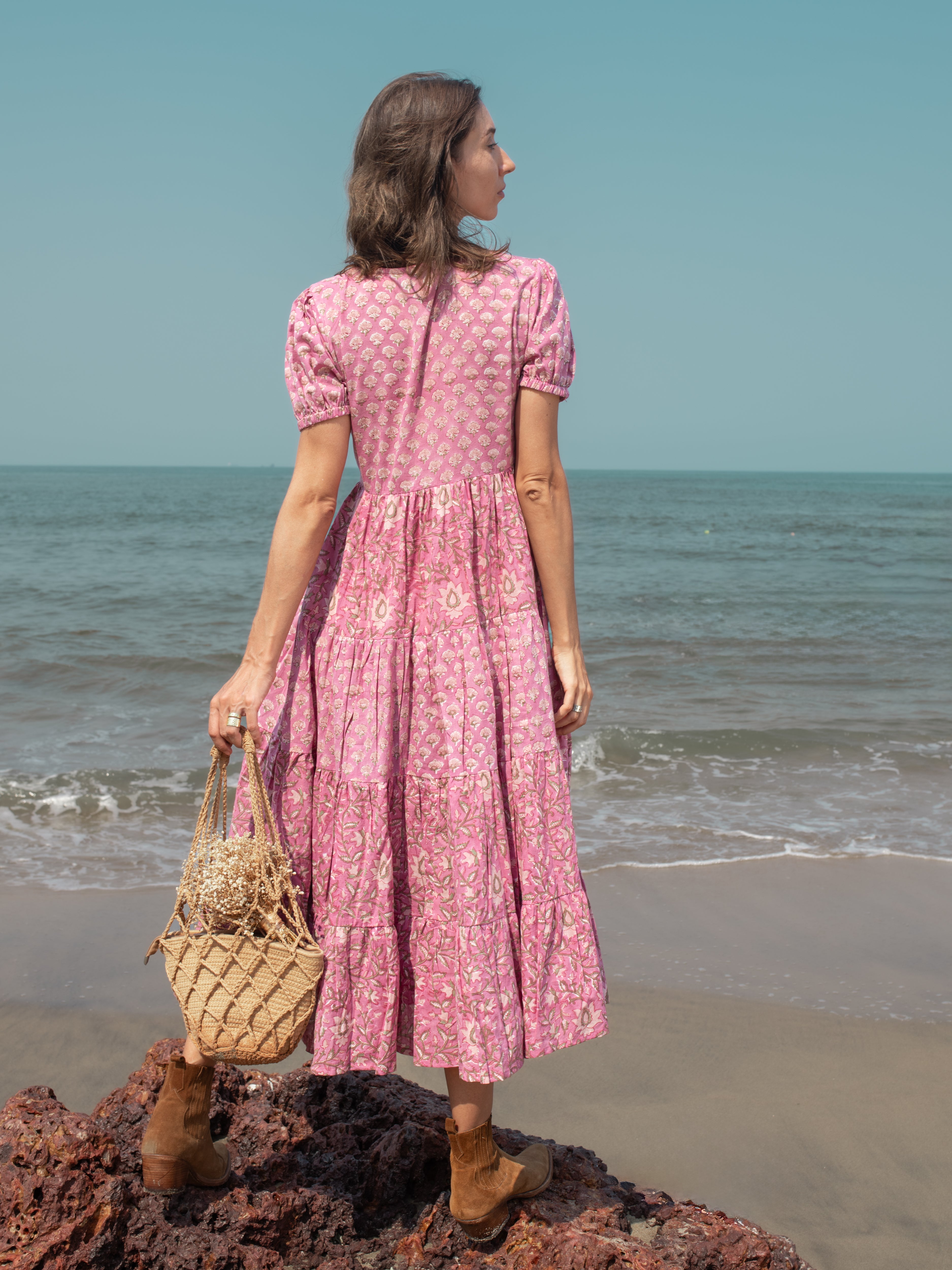 The beautiful tiered maxi dress features a floral print in a pink color scheme and flared tiered, crafted from 100% cotton fabric. This stylish outfit is designed with half sleeves and a hand block print. The vibrant flowers evoke a sense of romance and capture the carefree spirit of summer, making it the perfect choice for any occasion.