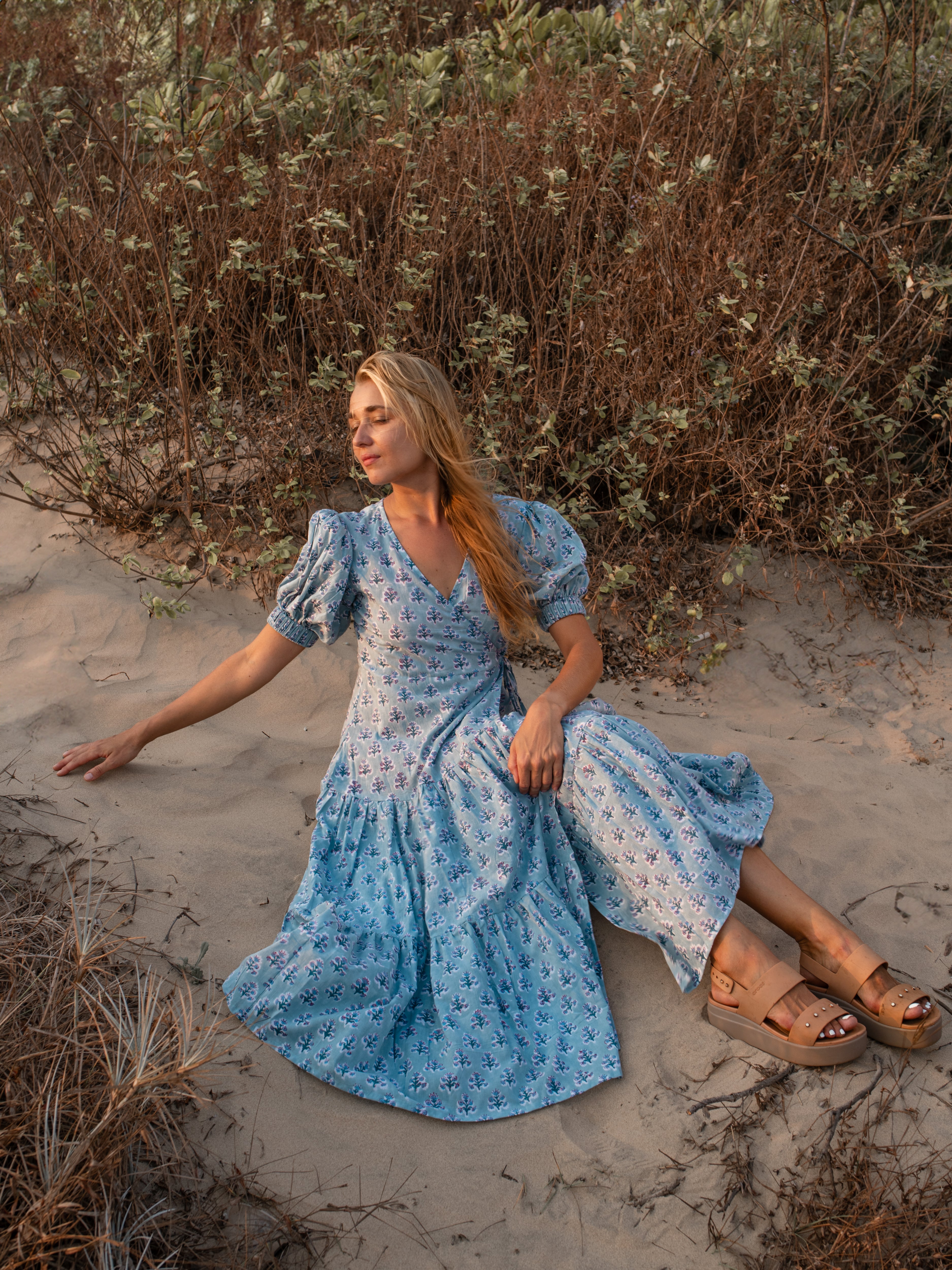 The enchanting wrap maxi dress features a blue color scheme, crafted from 100% cotton fabric. This stylish outfit is designed with drawstring puffed sleeves and a hand block print with side pocket. The vibrant flowers evoke a sense of romance and capture the carefree spirit of summer, making it the perfect choice for any occasion.