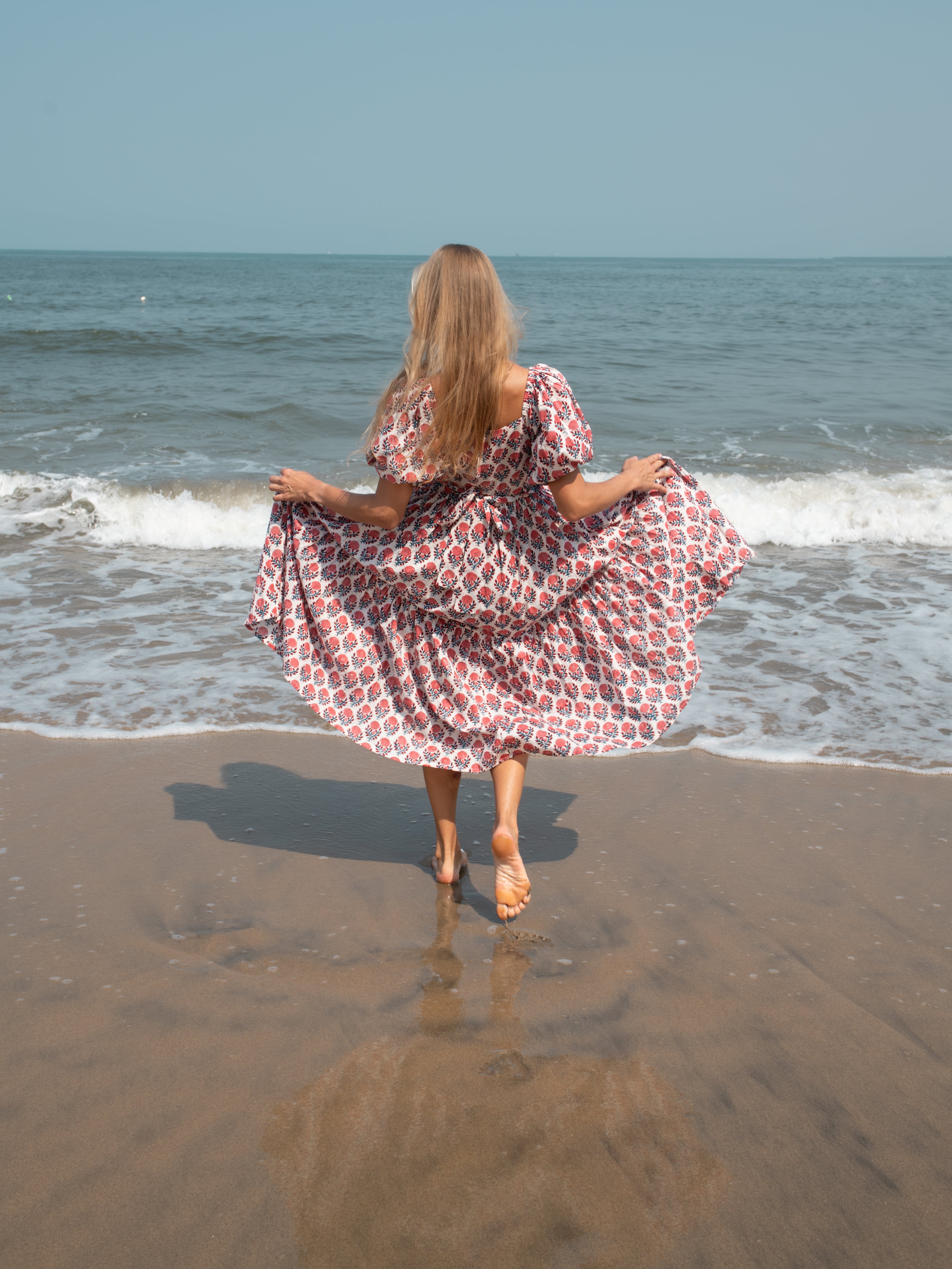 The lovely long maxi dress features a white and red color scheme, crafted from 100% cotton fabric. This stylish outfit is designed with drawstring puffed sleeves and a hand block print with side pocket. The vibrant flowers evoke a sense of romance and capture the carefree spirit of summer, making it the perfect choice for any occasion.