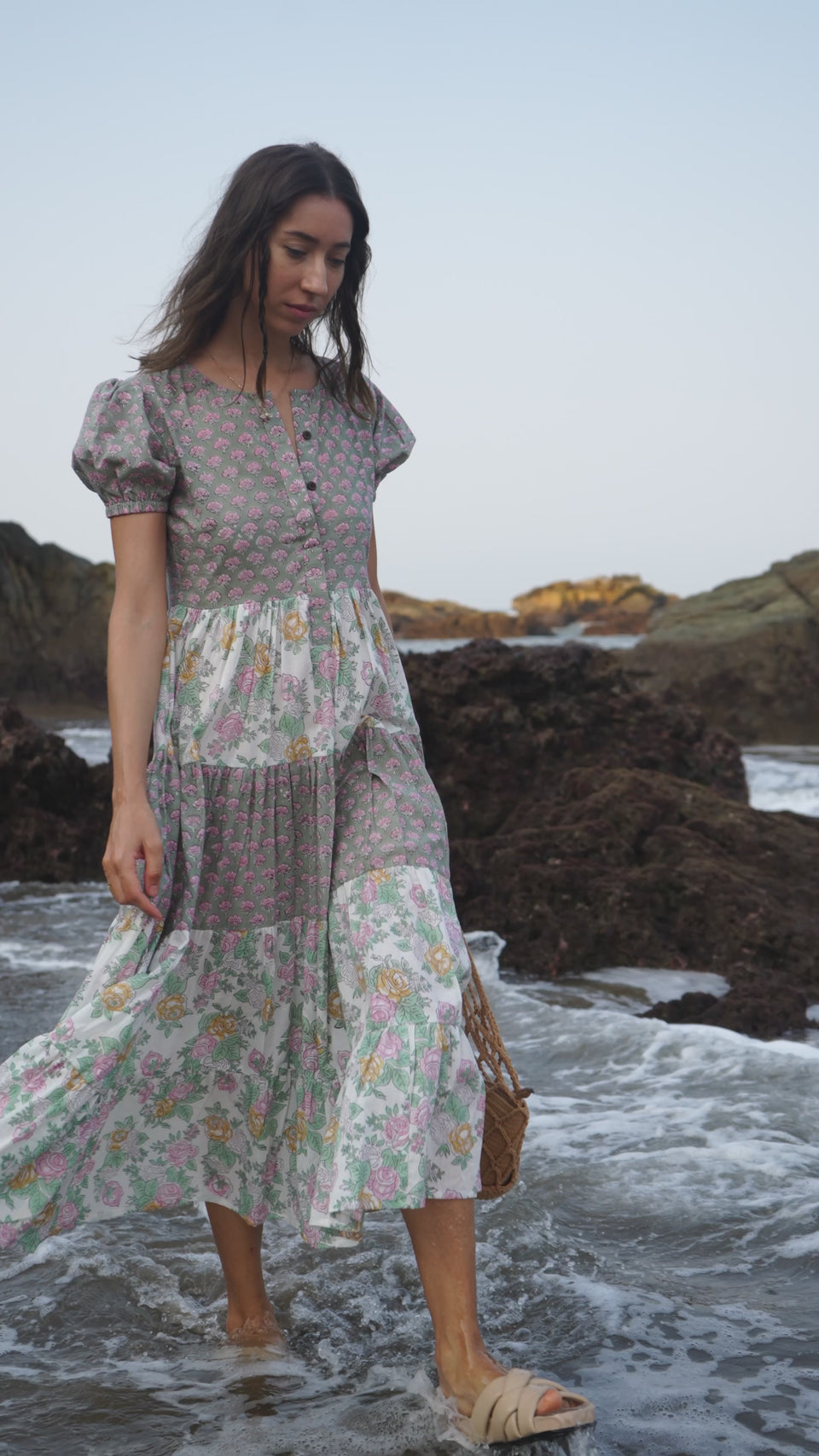 The beautiful tiered maxi dress features a floral print in a sage green and white color scheme and flared tiered, crafted from 100% cotton fabric. This stylish outfit is designed with half sleeves and a hand block print. The vibrant flowers evoke a sense of romance and capture the carefree spirit of summer, making it the perfect choice for any occasion.