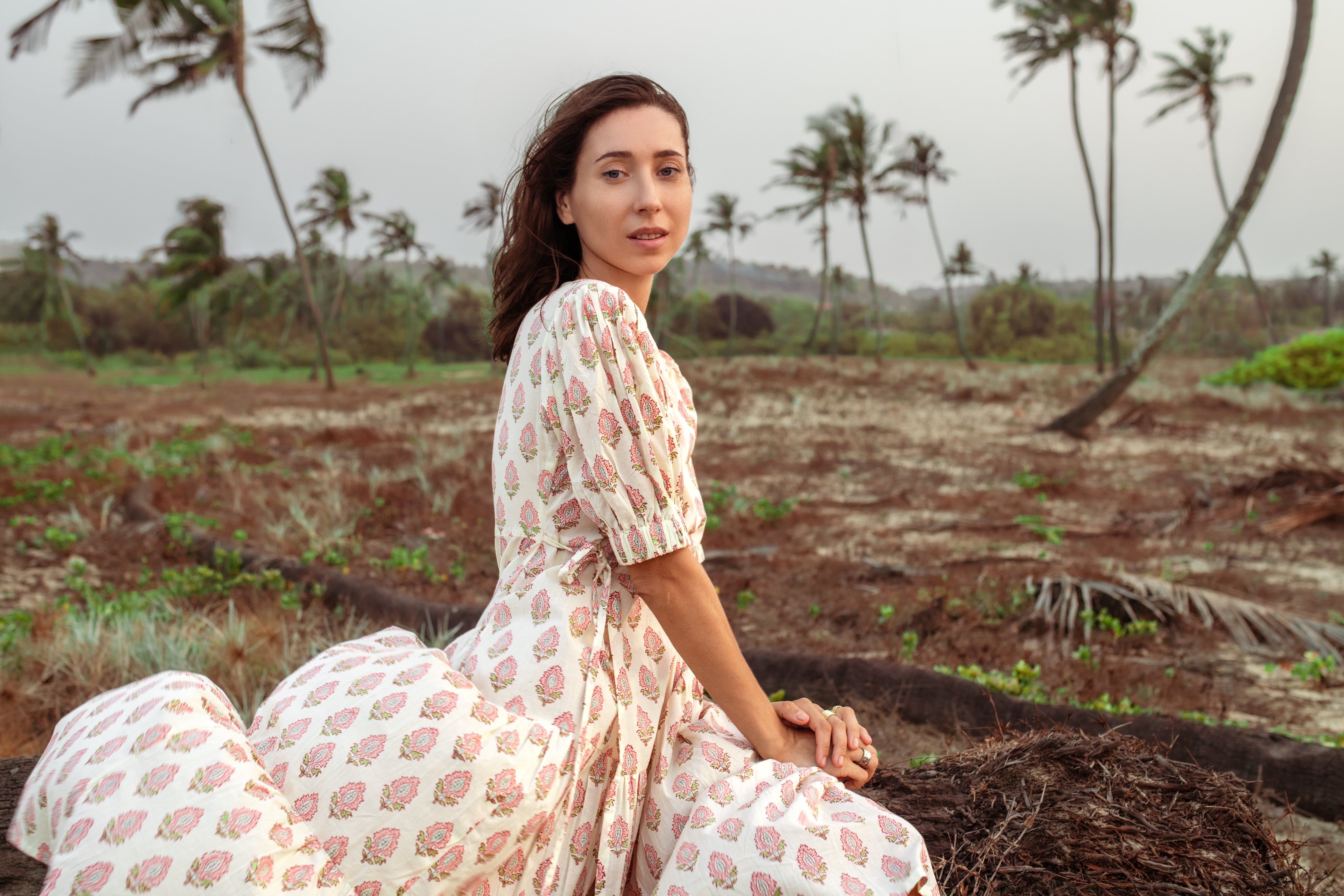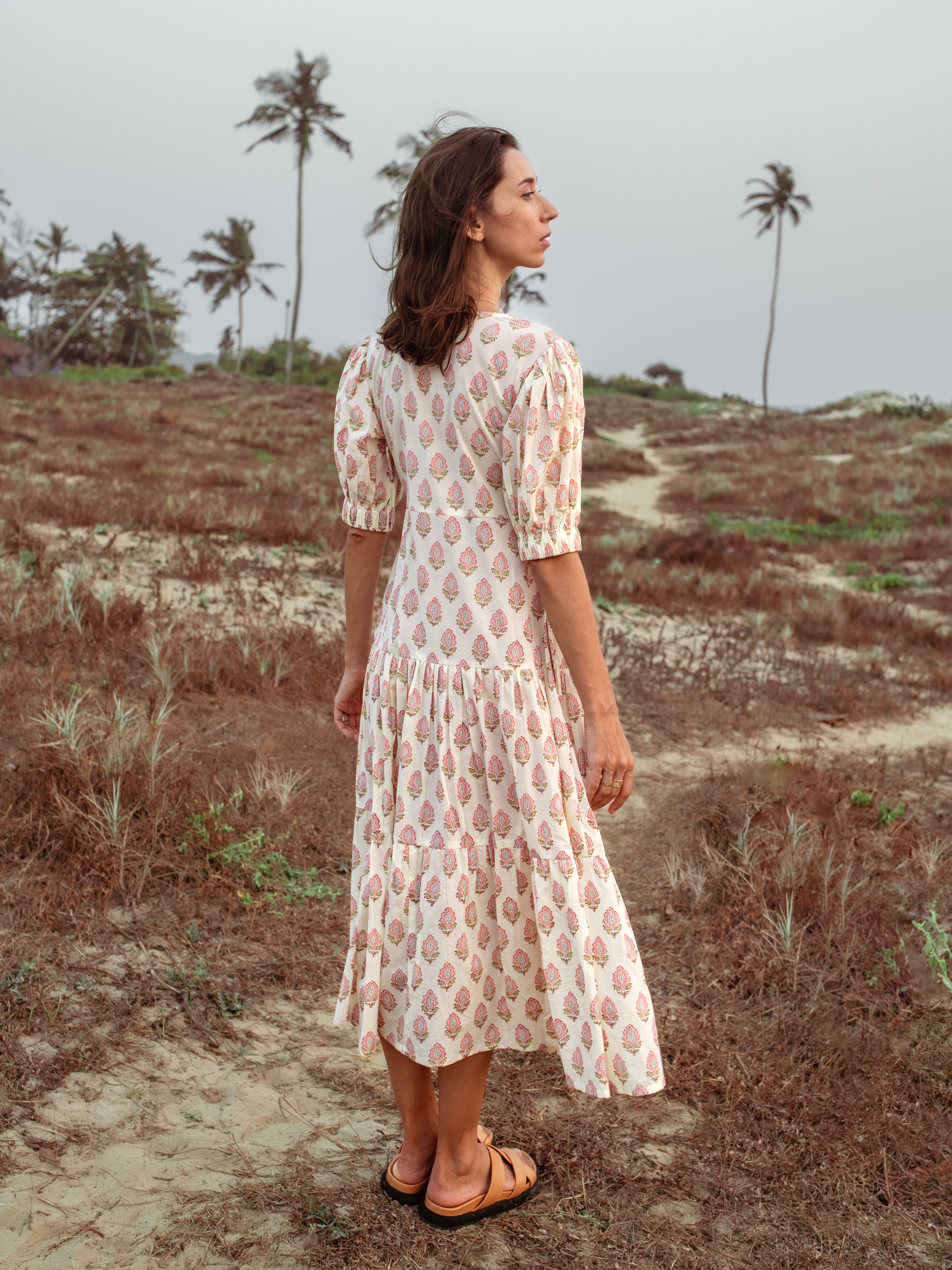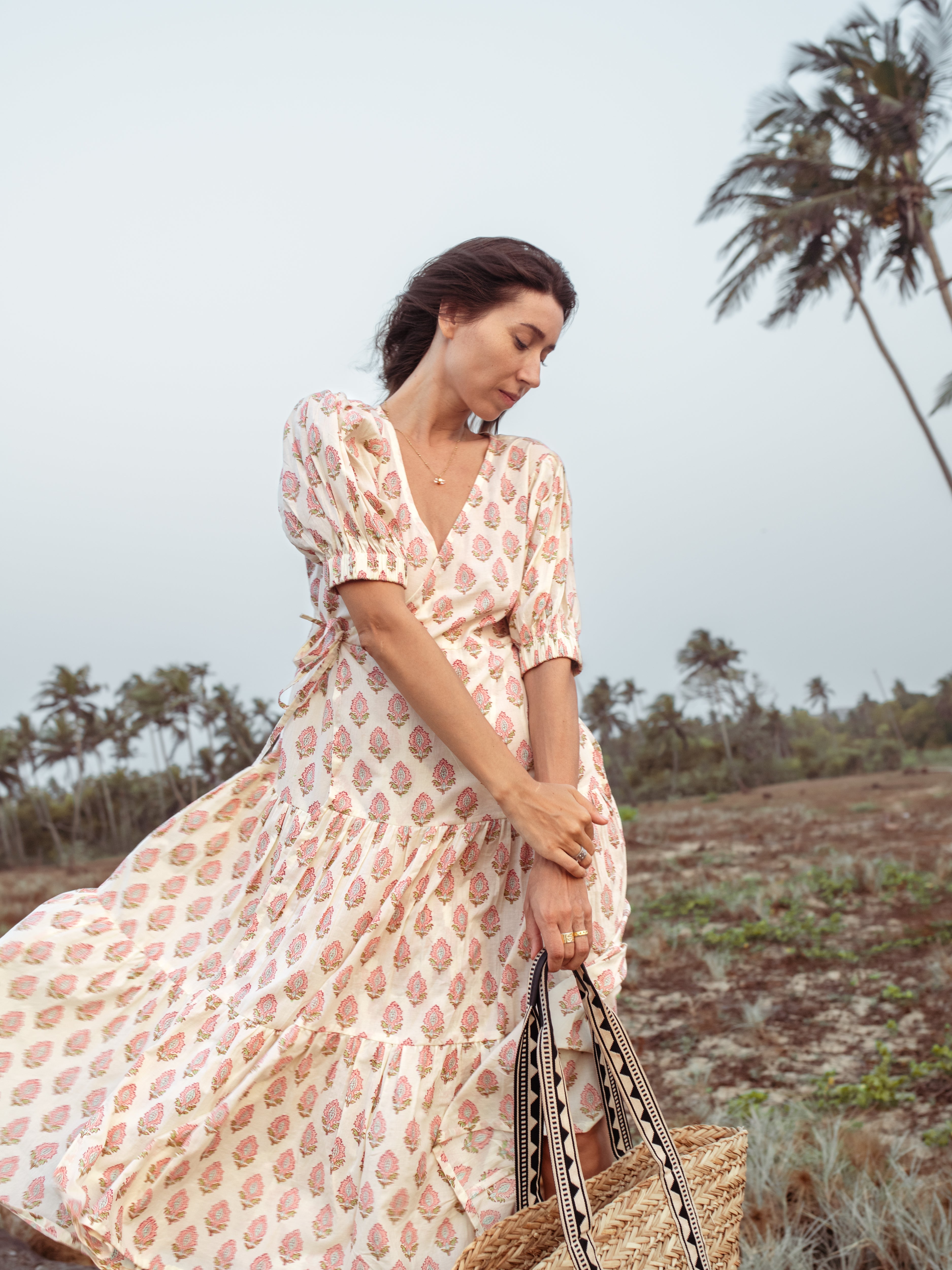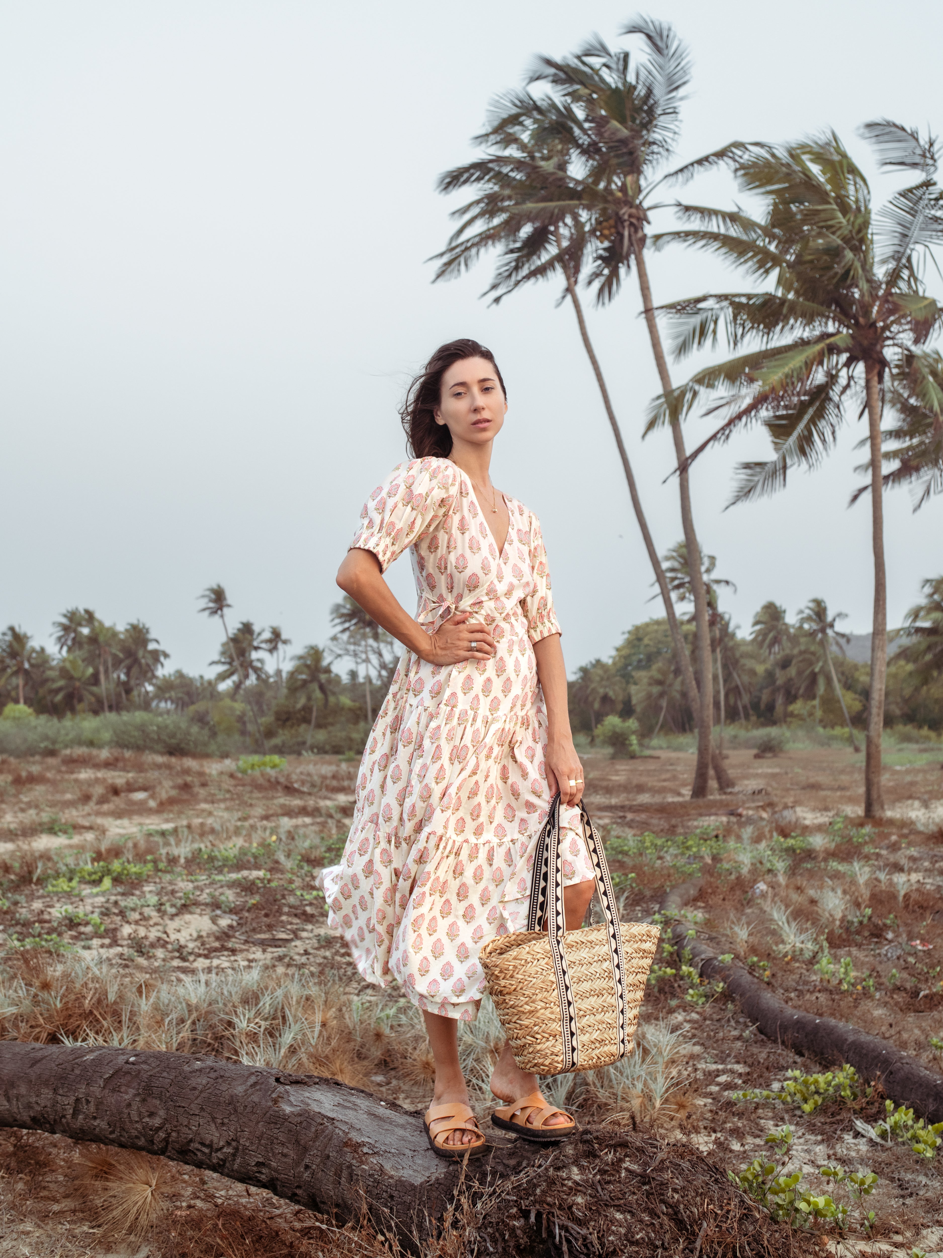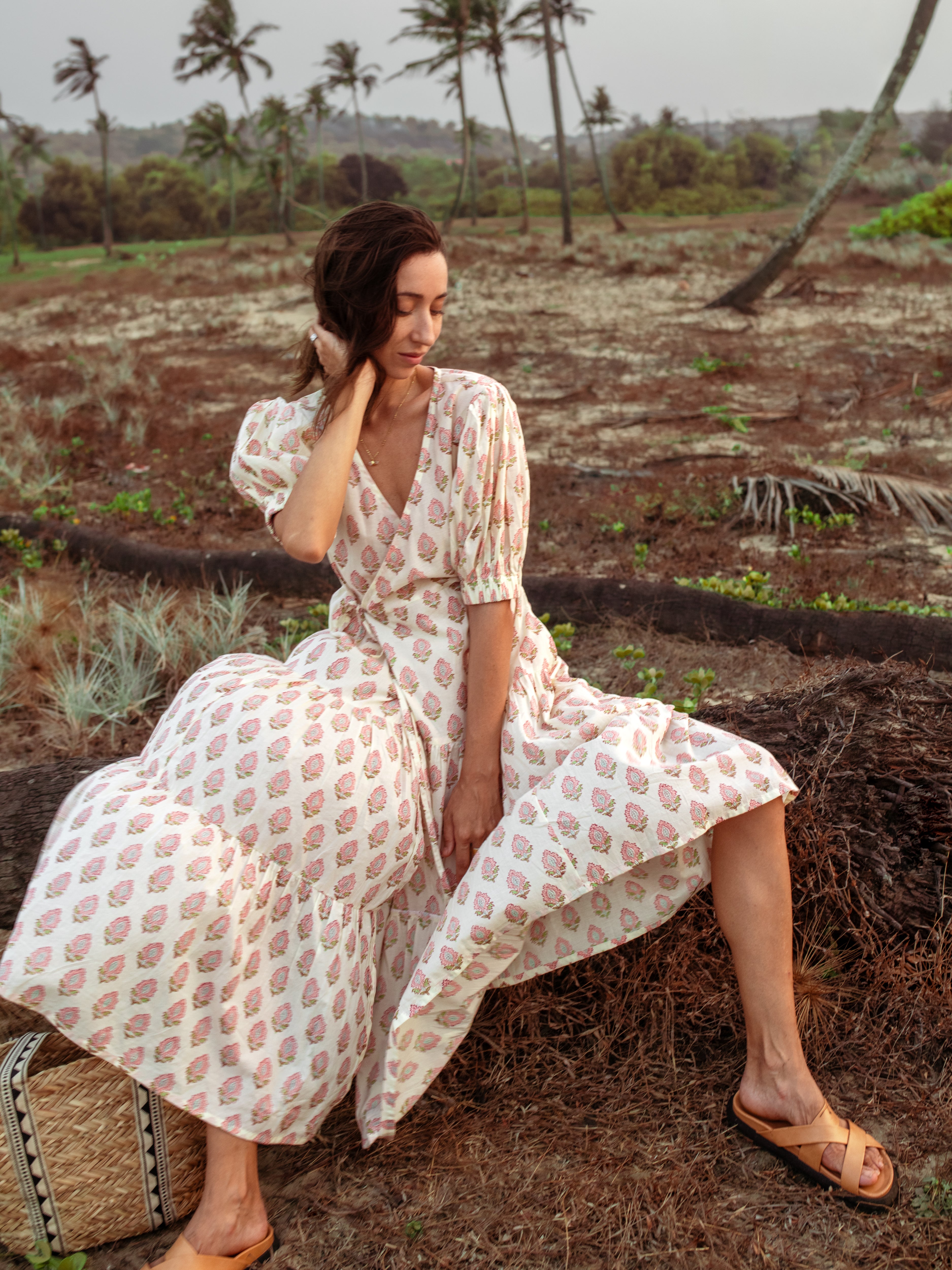 The enchanting wrap maxi dress features a off-white and green color scheme, crafted from 100% cotton fabric. This stylish outfit is designed with drawstring puffed sleeves and a hand block print with side pocket. The vibrant flowers evoke a sense of romance and capture the carefree spirit of summer, making it the perfect choice for any occasion.