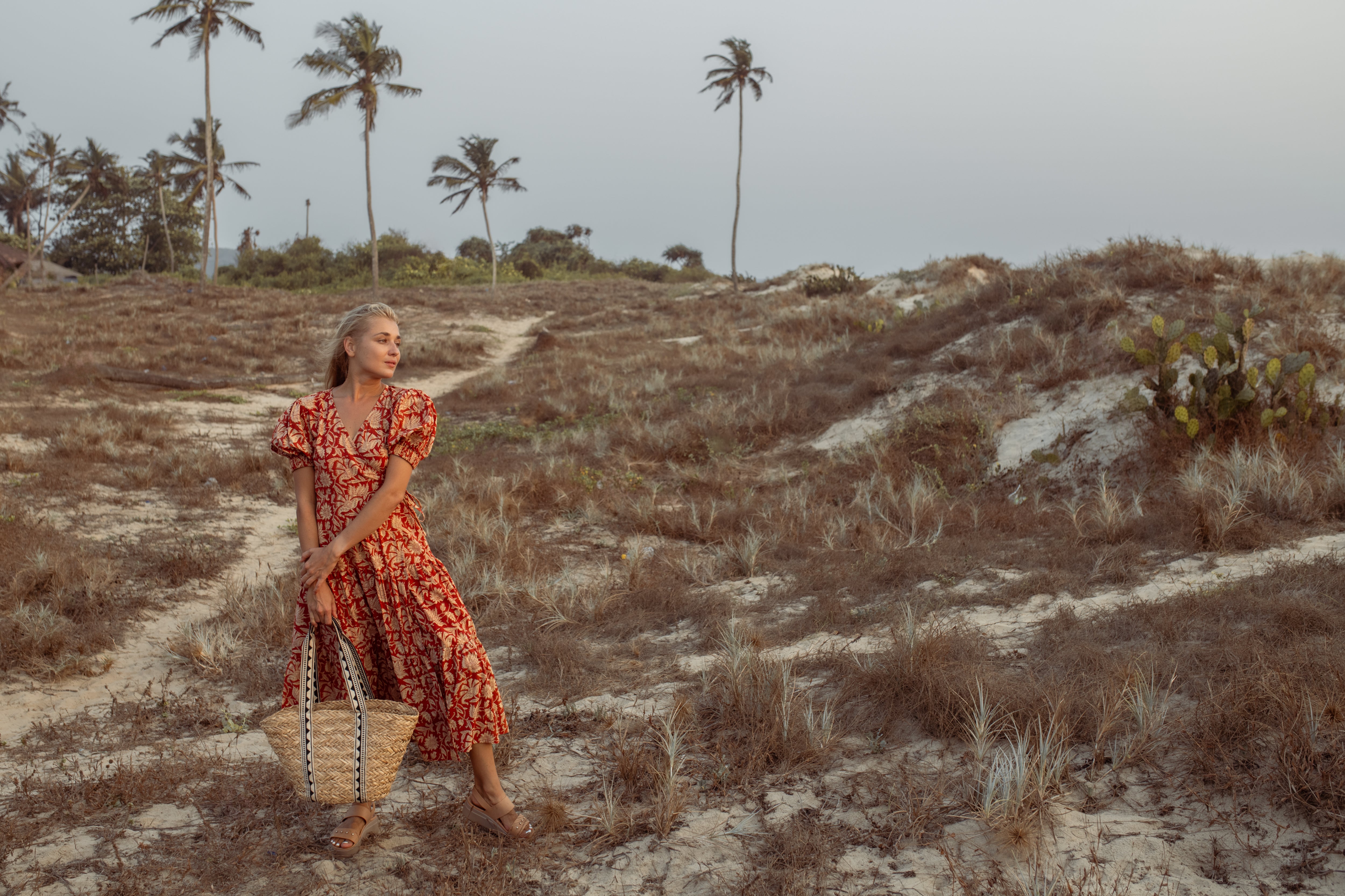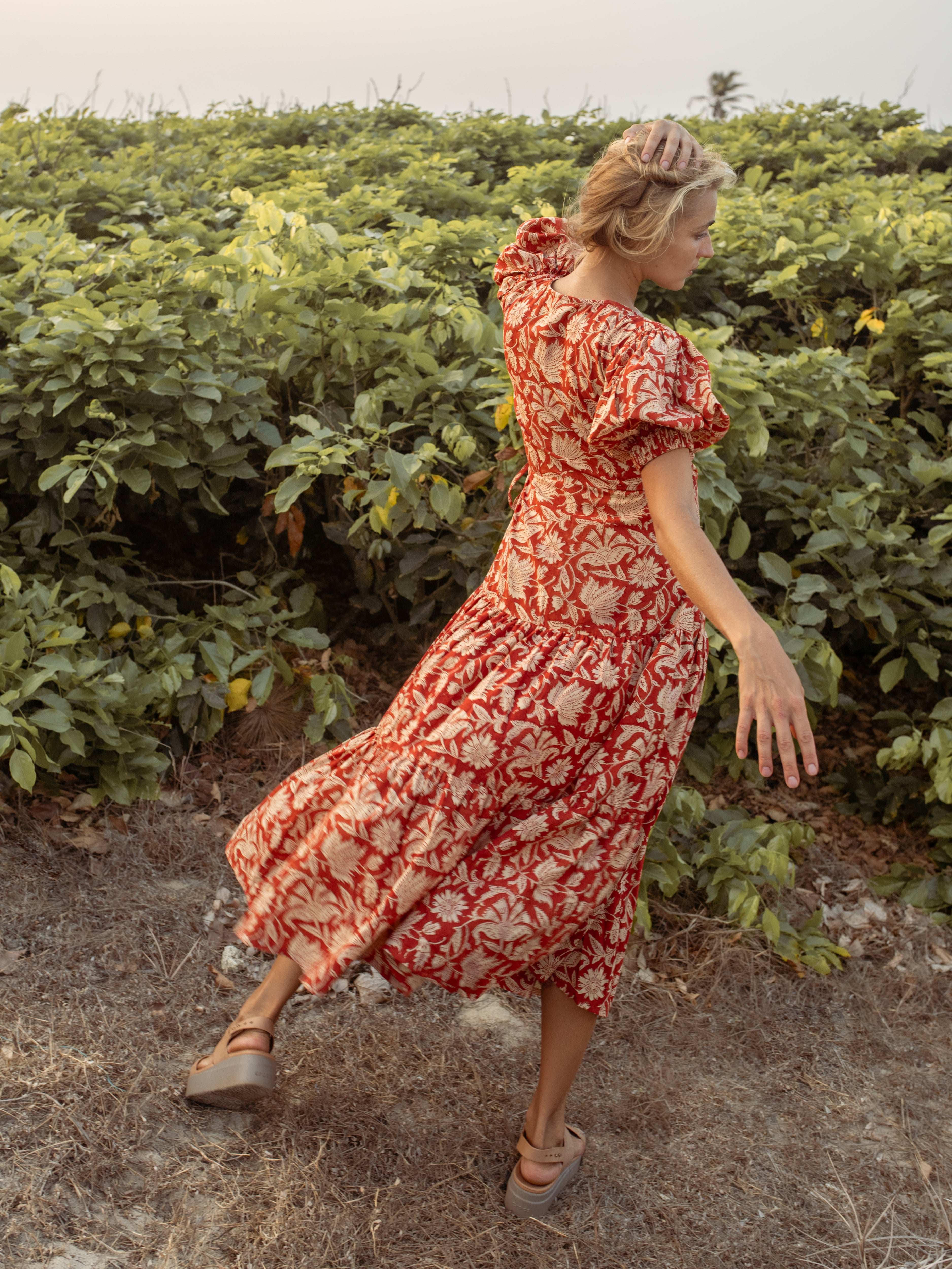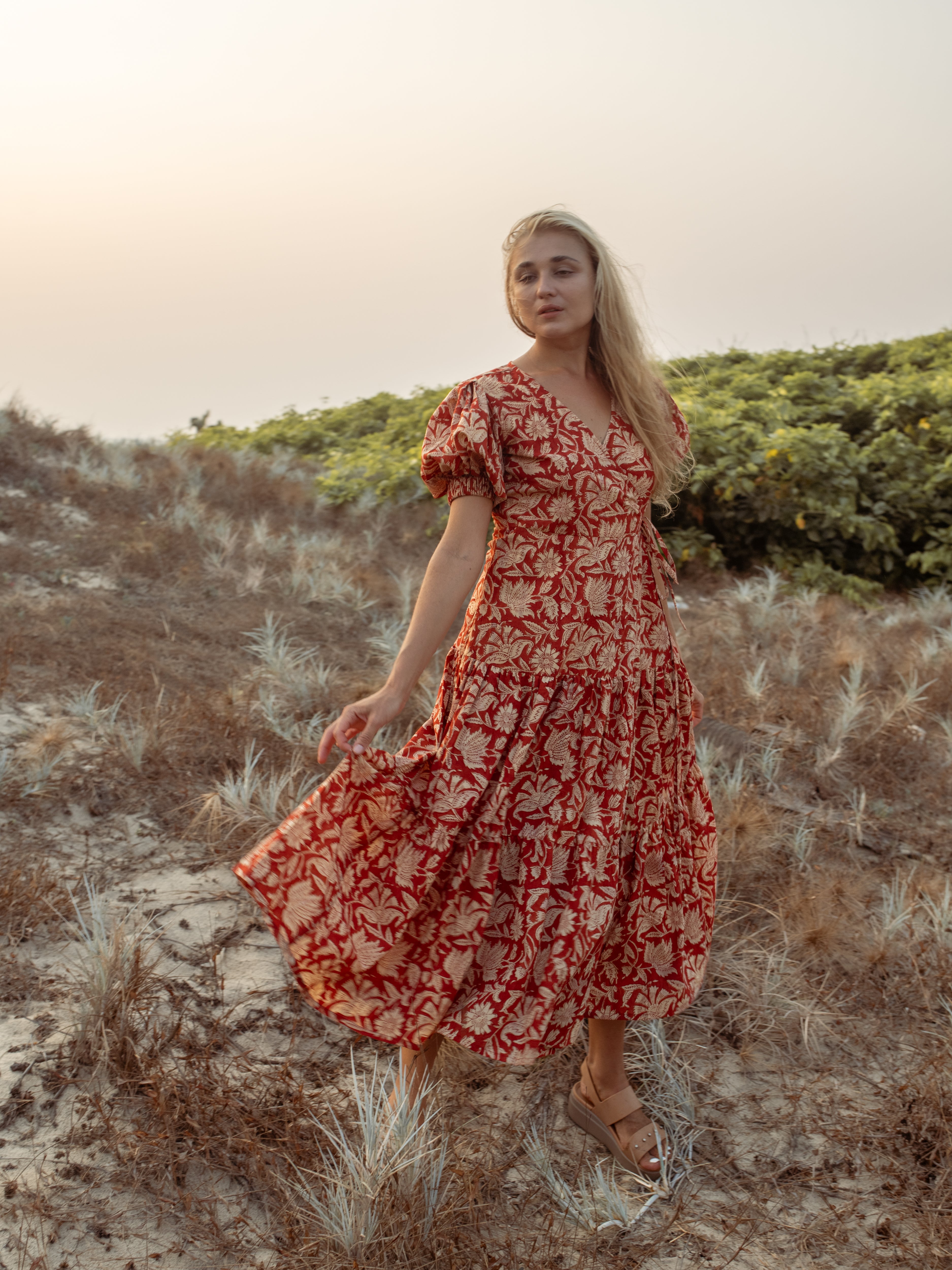 The enchanting wrap maxi dress features a rust red with yellow color scheme, crafted from 100% cotton fabric. This stylish outfit is designed with drawstring puffed sleeves and a hand block print with side pocket. The vibrant flowers evoke a sense of romance and capture the carefree spirit of summer, making it the perfect choice for any occasion.
