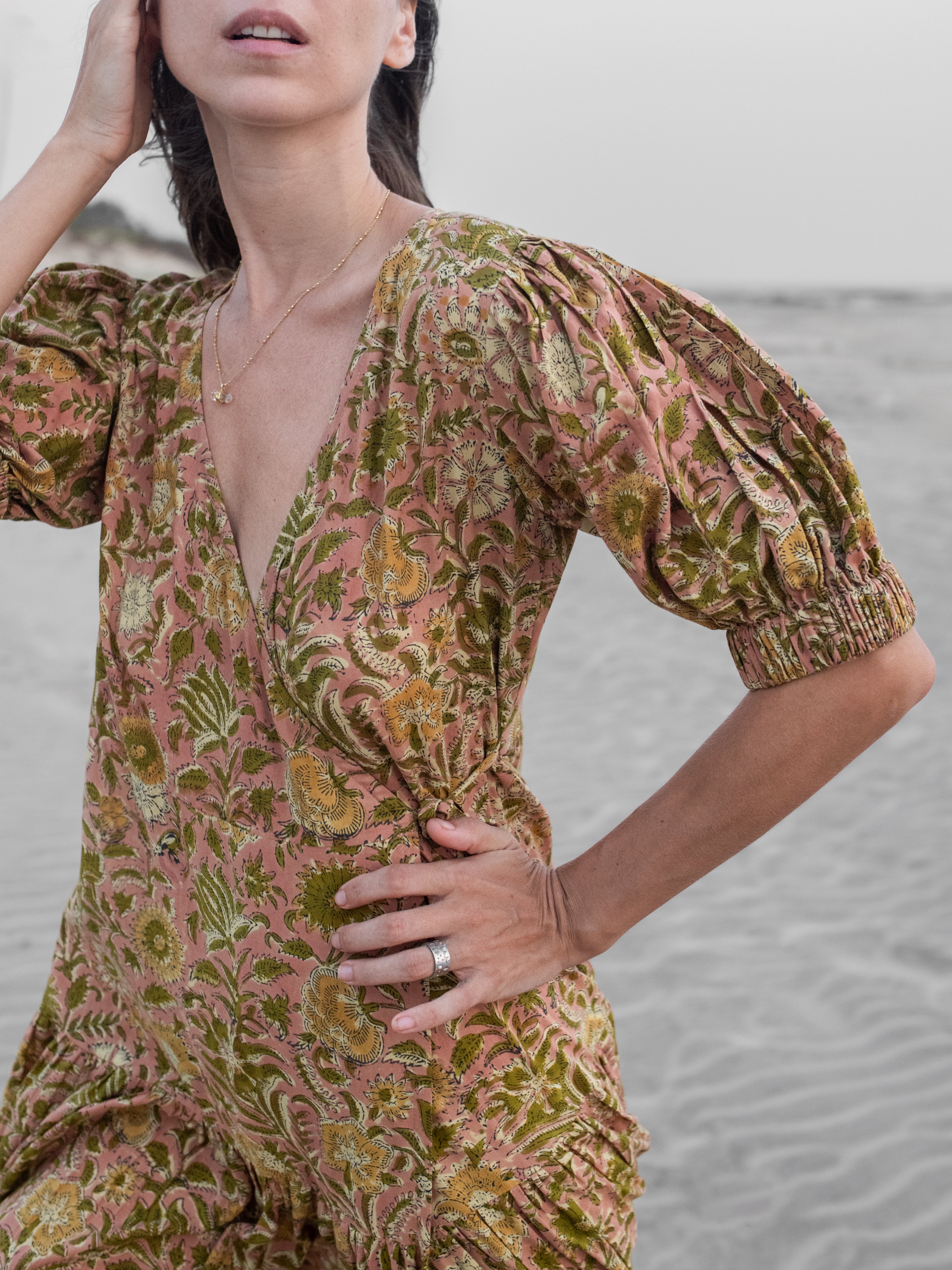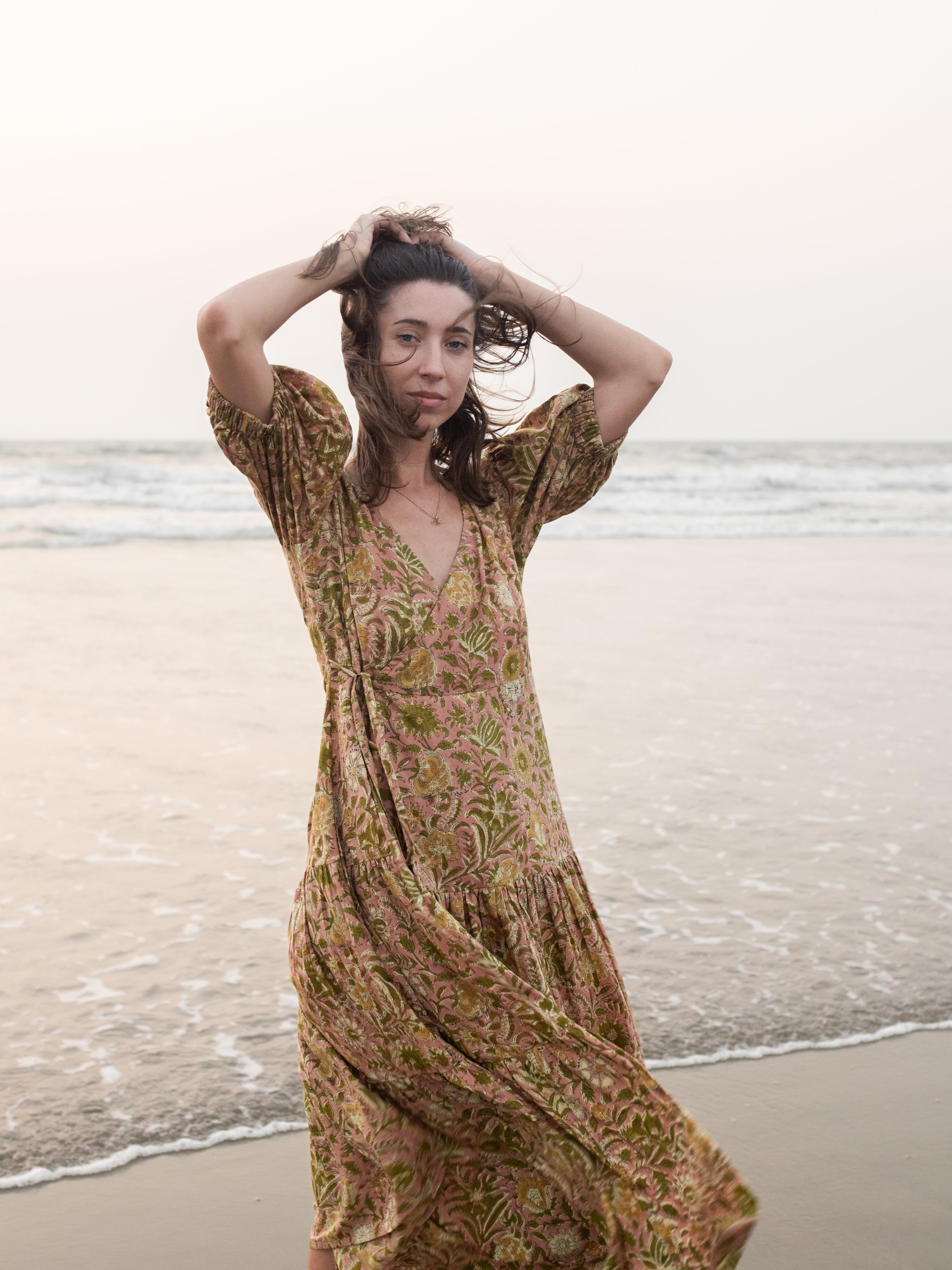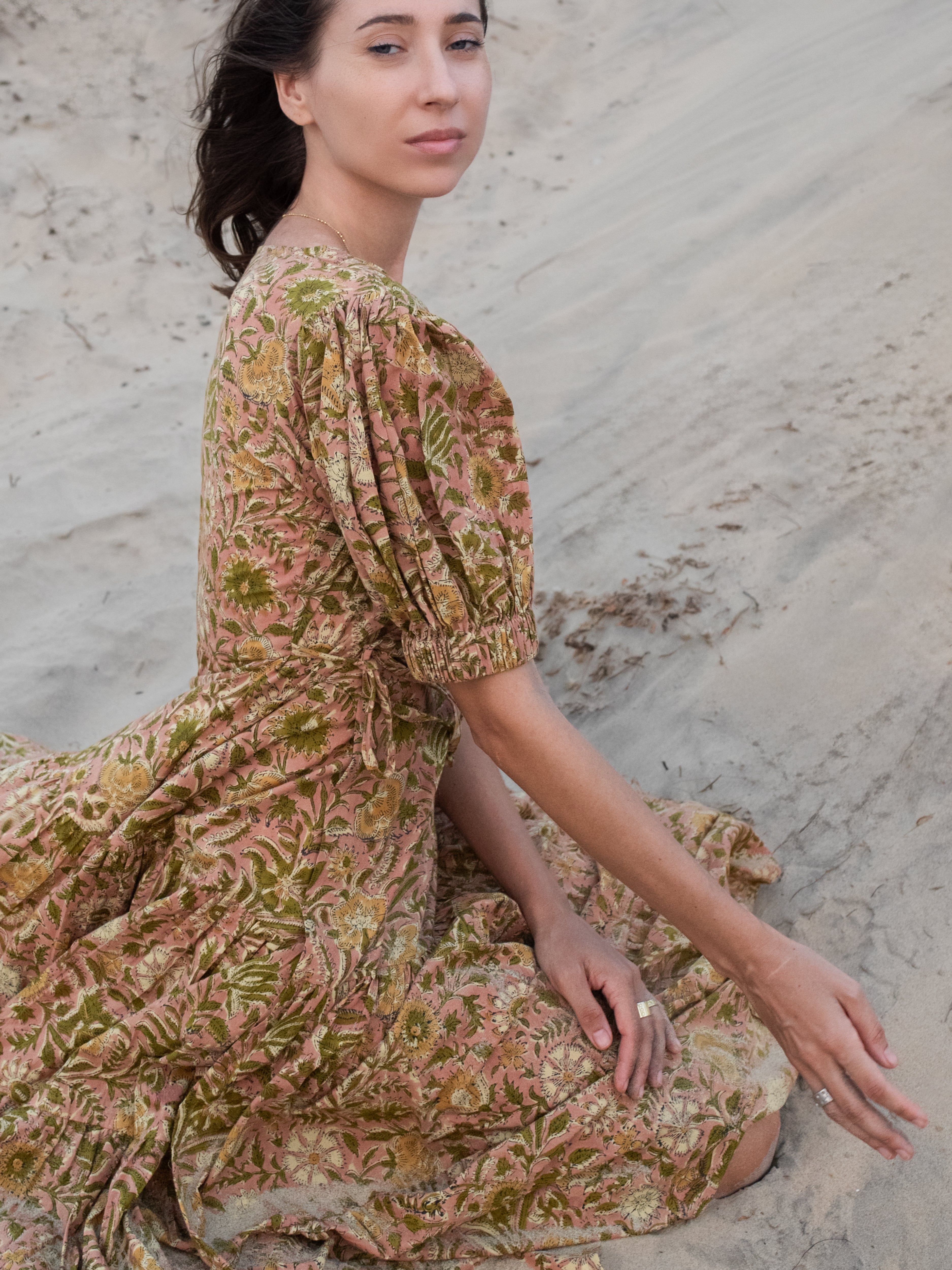 The enchanting wrap maxi dress features a off-white and green color scheme, crafted from 100% cotton fabric. This stylish outfit is designed with drawstring puffed sleeves and a hand block print with side pocket. The vibrant flowers evoke a sense of romance and capture the carefree spirit of summer, making it the perfect choice for any occasion.