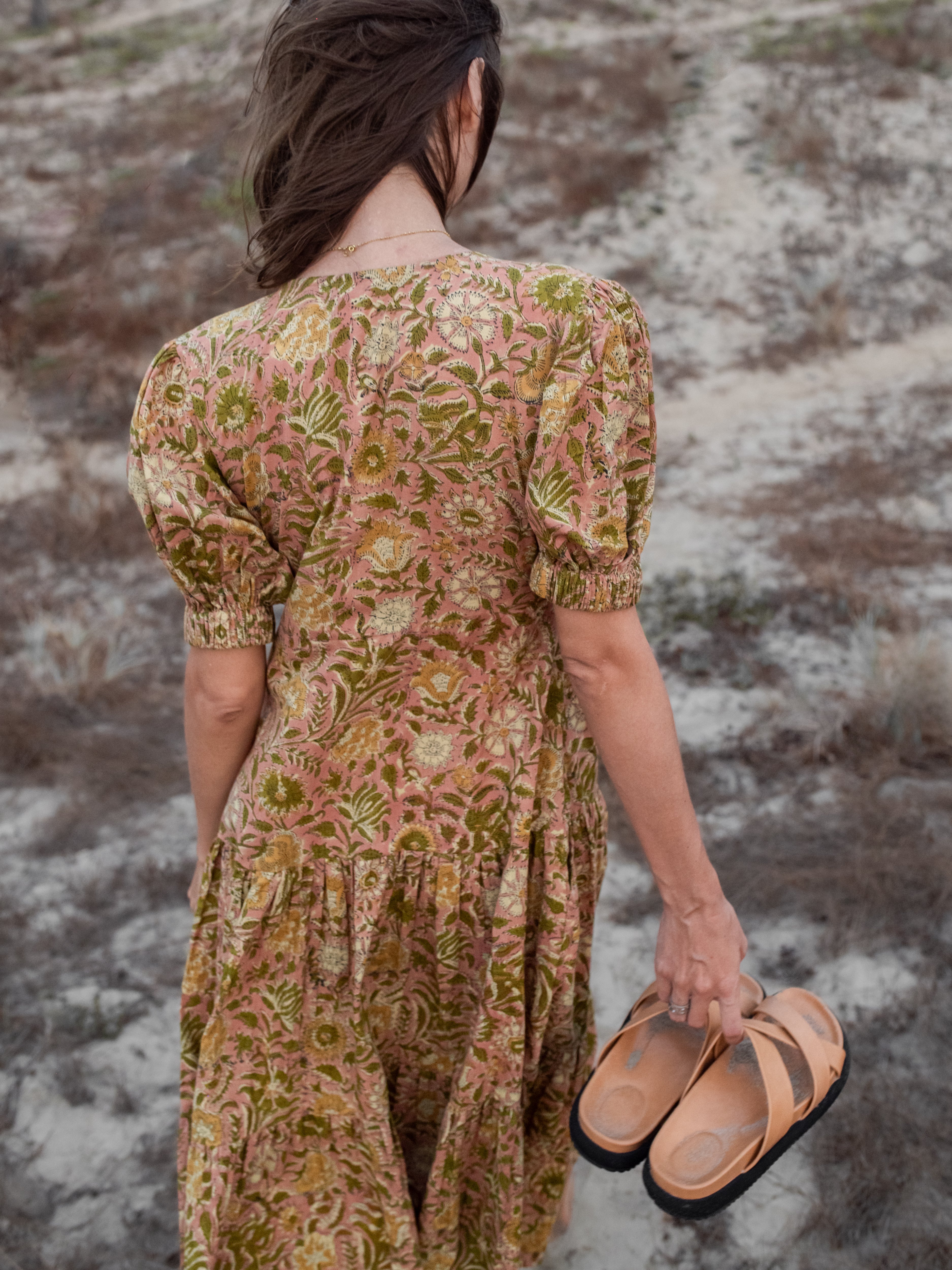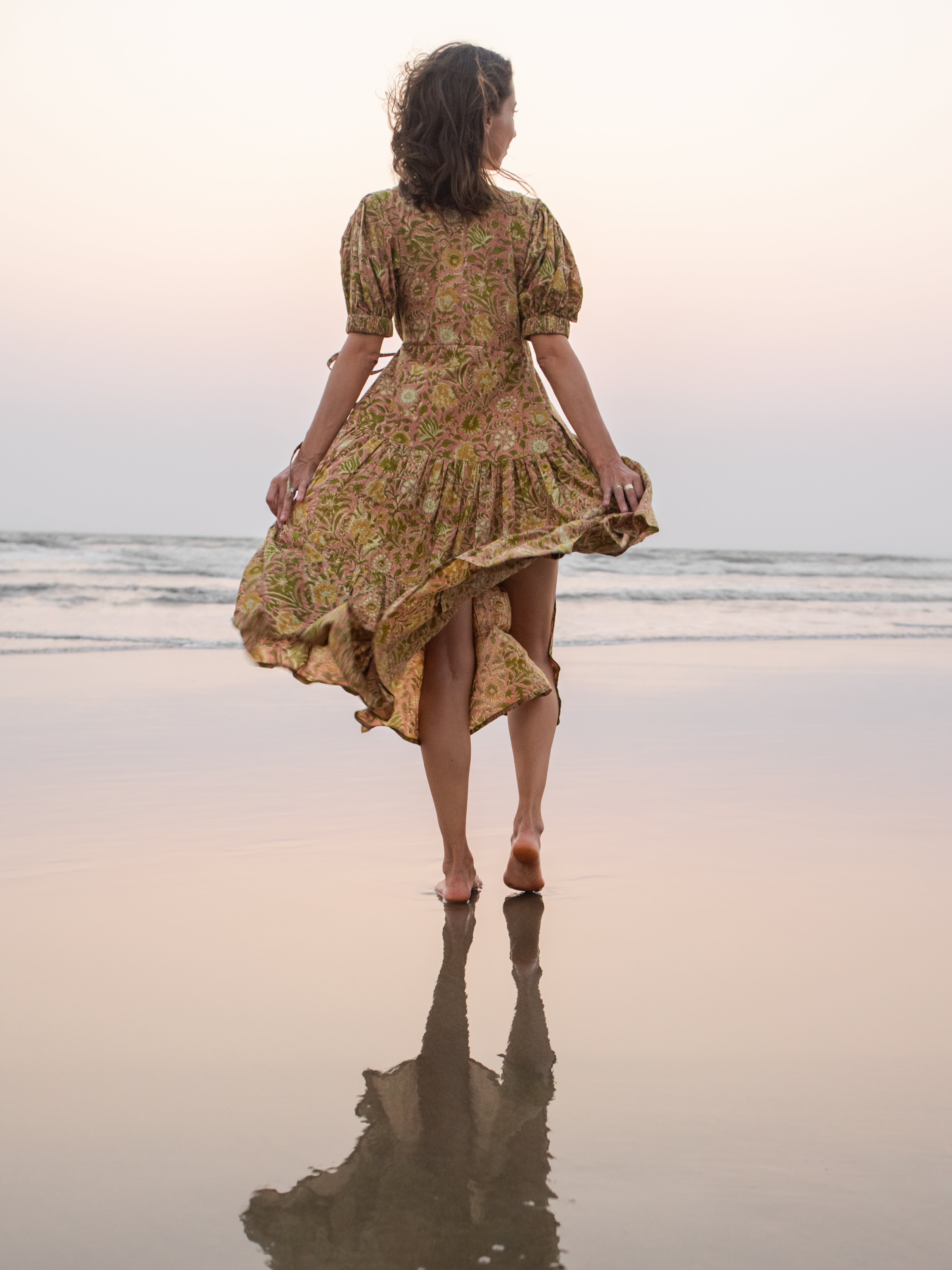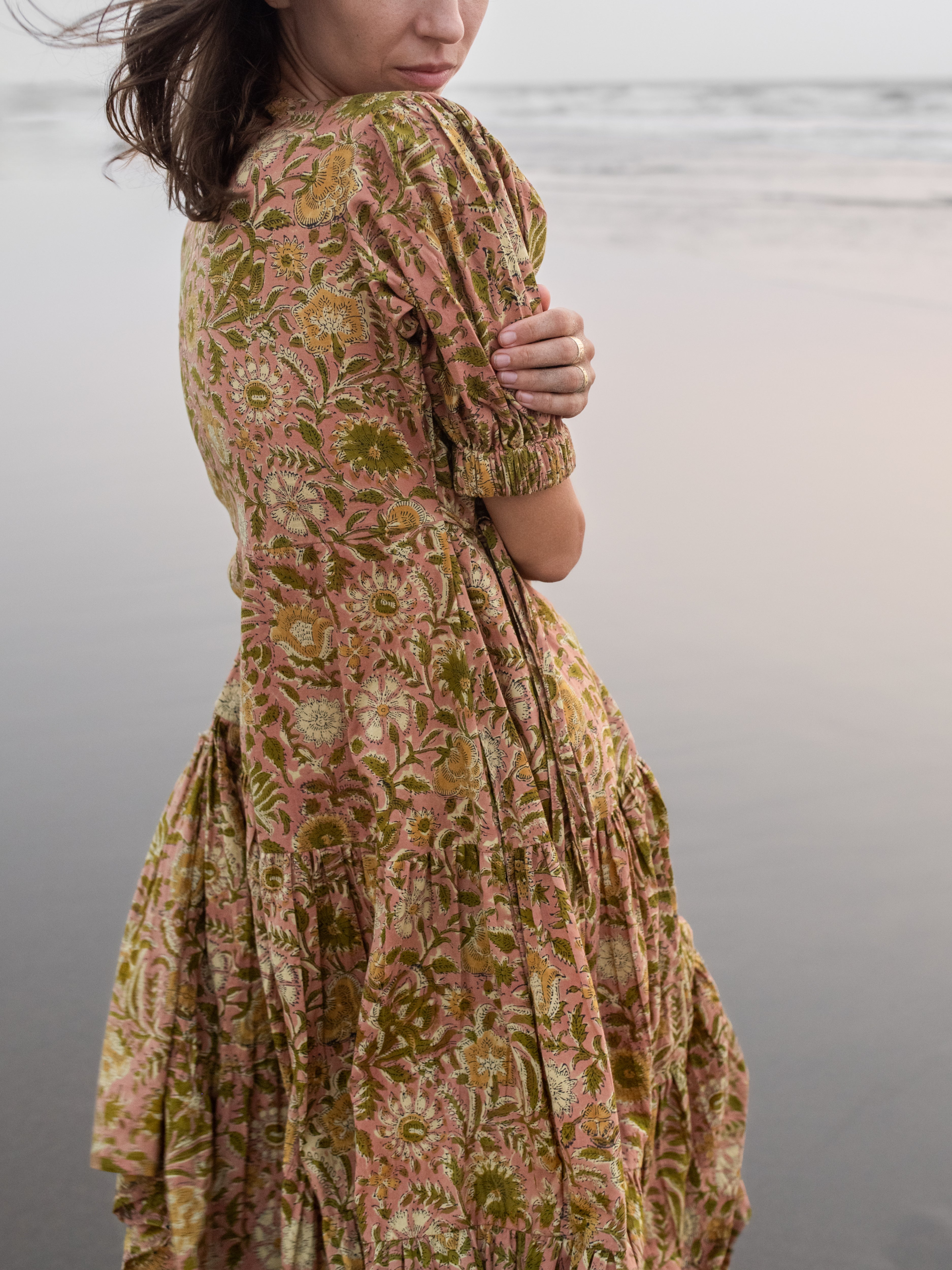 The enchanting wrap maxi dress features a off-white and green color scheme, crafted from 100% cotton fabric. This stylish outfit is designed with drawstring puffed sleeves and a hand block print with side pocket. The vibrant flowers evoke a sense of romance and capture the carefree spirit of summer, making it the perfect choice for any occasion.