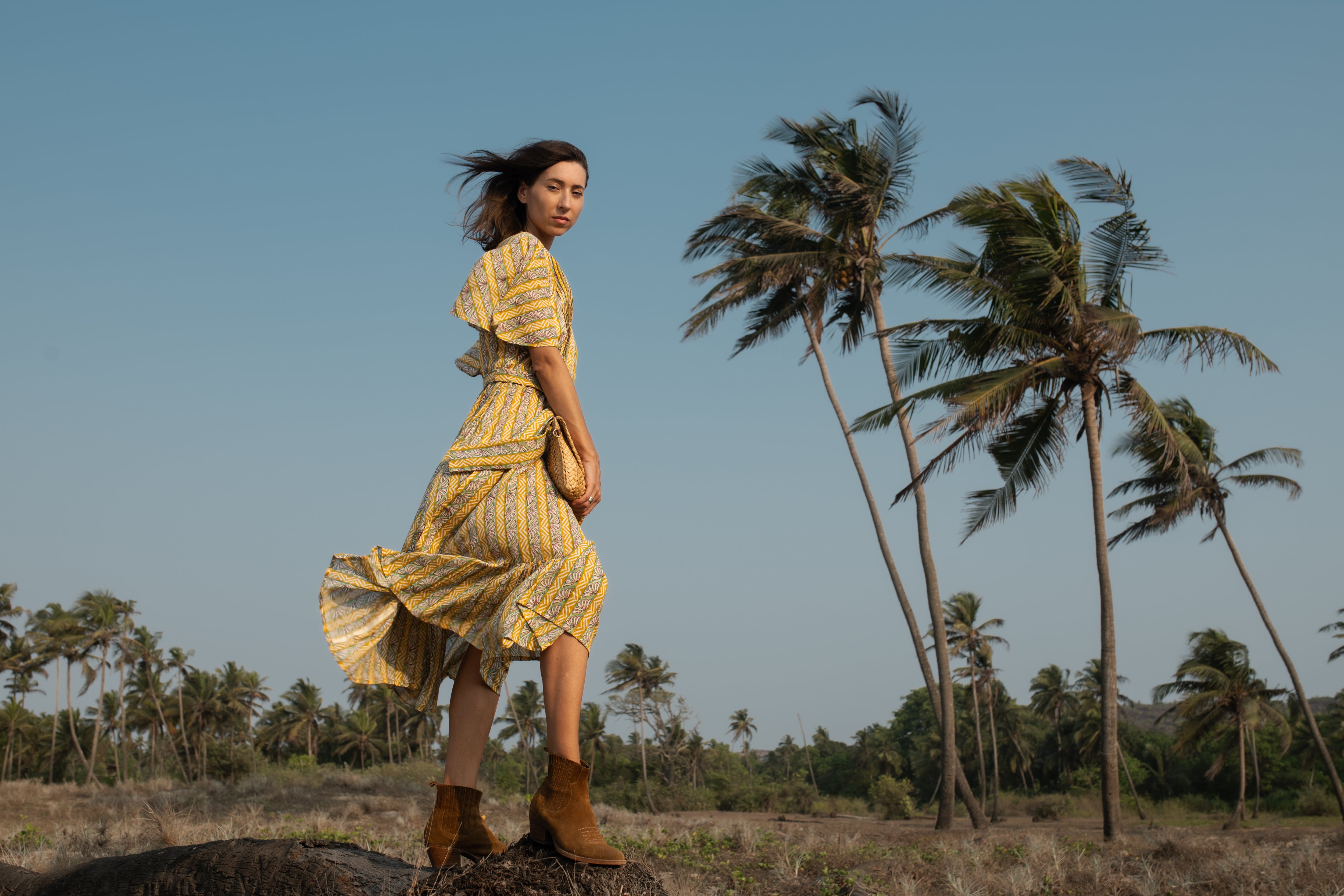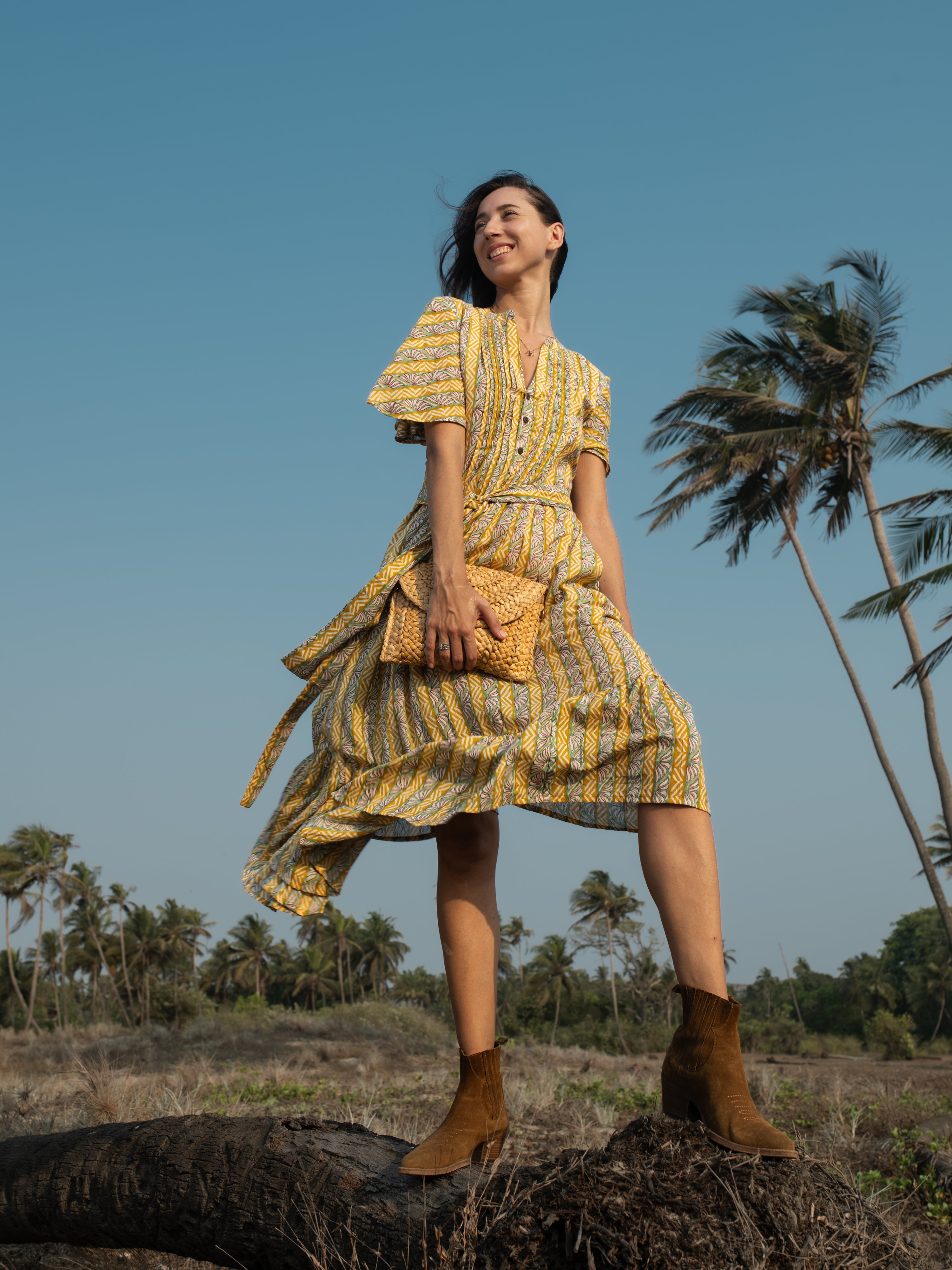 The gorgeous maxi dress features a floral print in a yellow and green color scheme, crafted from 100% cotton fabric. This stylish outfit is designed with cape sleeves and a hand block print, complemented by charming belt  as accent embellishments. The vibrant flowers evoke a sense of romance and capture the carefree spirit of summer.